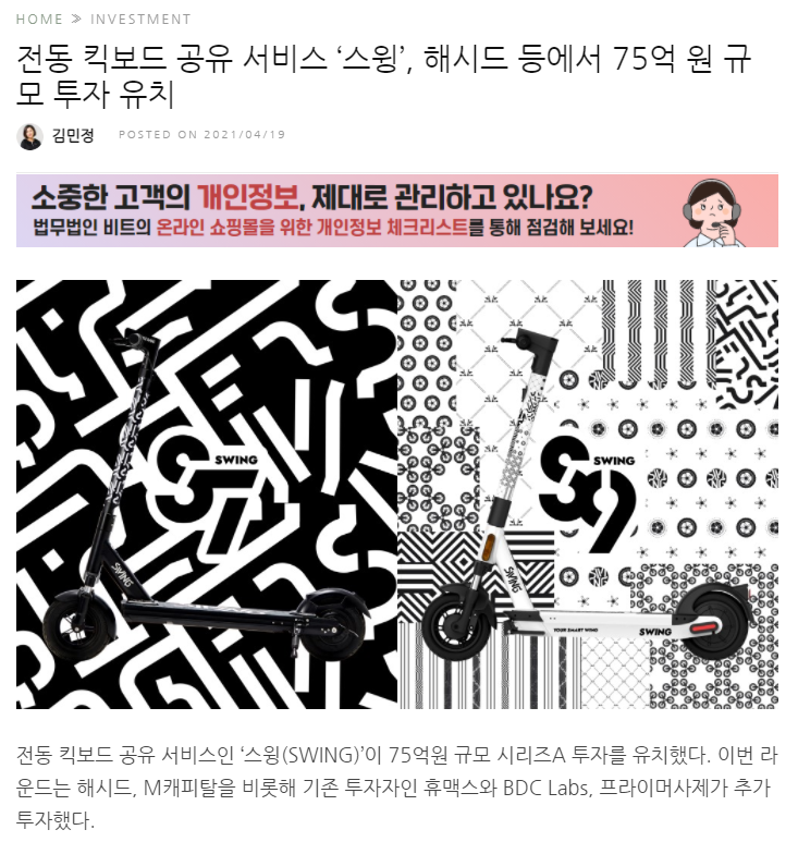 2019년 8월 와디즈를 통해서 '더스윙' 이라는 공유 전동킥보드 서비스하는 스타트업에 투자하게 되었습니다. 그런데 지난달 4월 19일에 시리즈 A 75억 투자유치라는 쾌거를 이뤘네요.